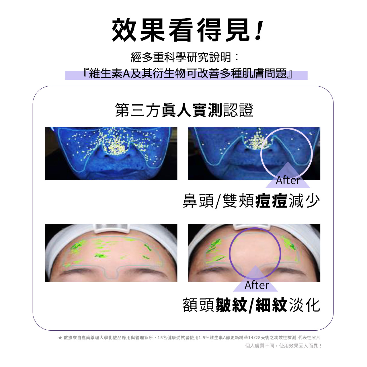 • 藍標A醇精華液:化妝水後使用,可每天晚上保養使用。