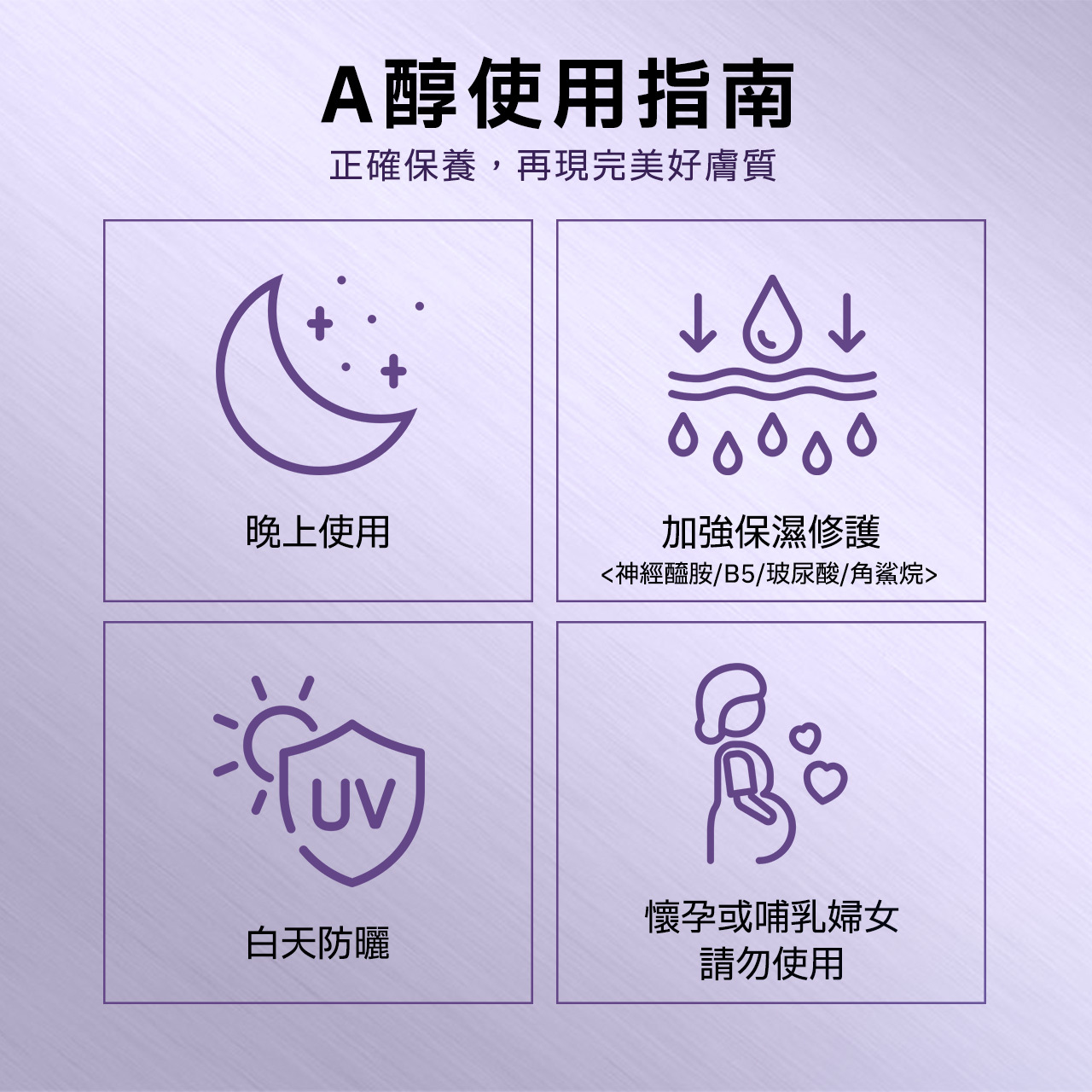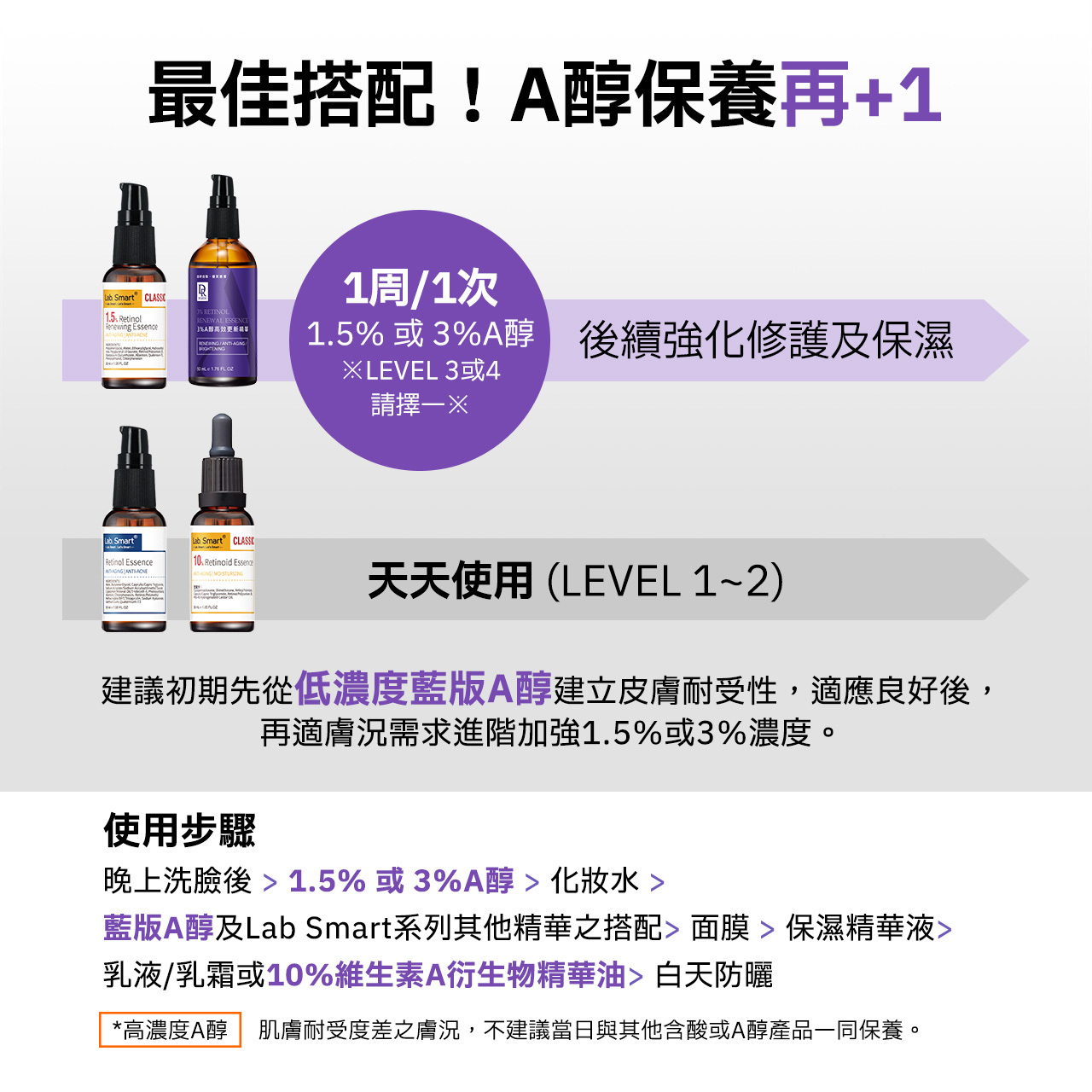 • 黃標1.5%A醇或高效3%醇:洗臉後化妝水前,建議每周1-2次,可適膚況增加或減少。