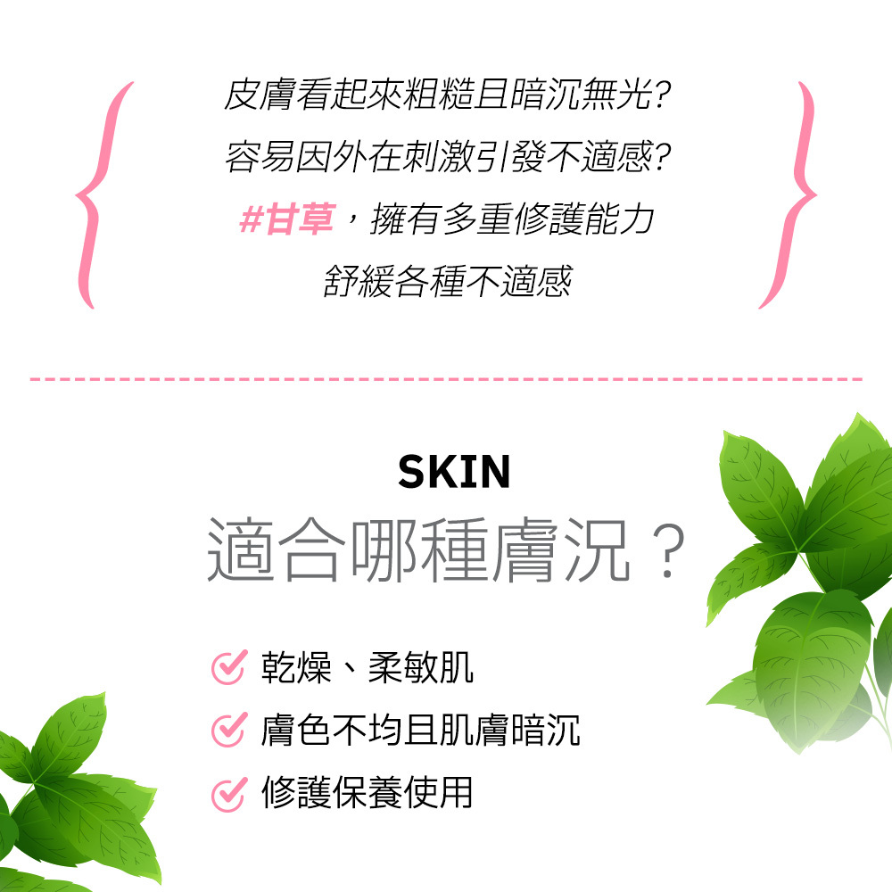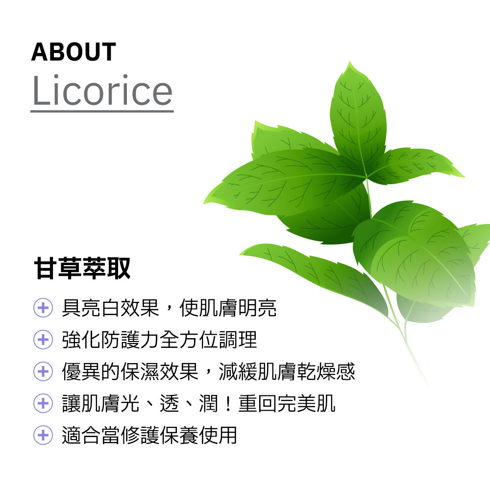 甘草精華能提升肌膚屏障力,幫助肌膚維持良好狀態,對肌膚功效還可提升淨白度!適合當修護保養使用。