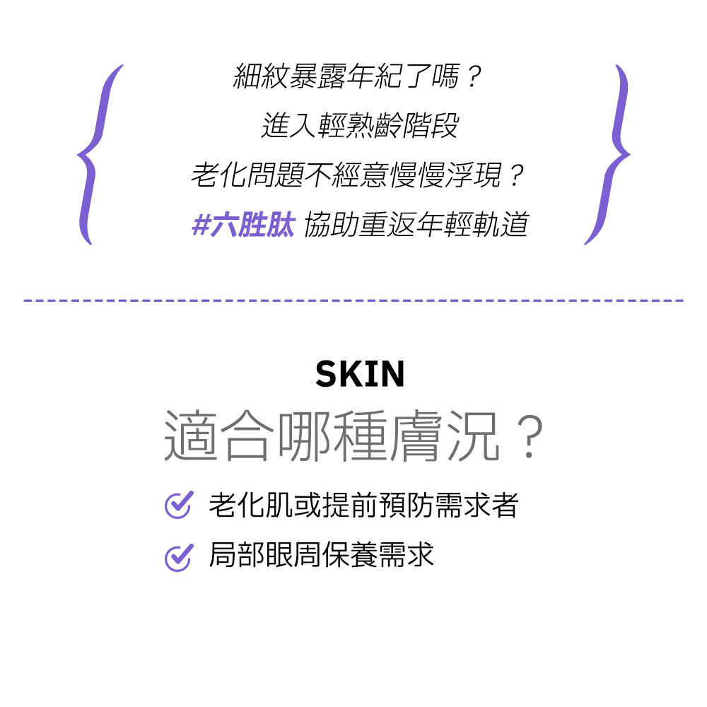 眼周肌膚易長細紋,讓你看起來容易老10歲?人氣暢銷★抗老指定「六胜肽精華 」有助於淡化臉部細紋、緊緻膚質。