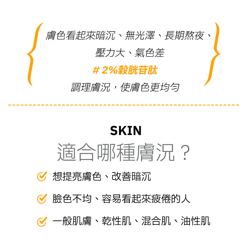 膚色看起來暗沉、無光澤、長期熬夜、壓力大、氣色差調理膚況,使膚色更均勻。