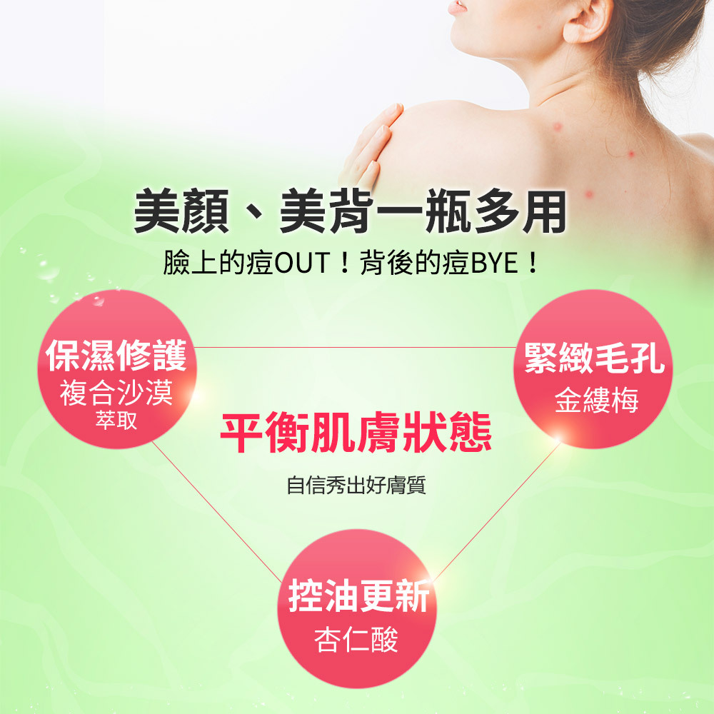 ‧抗痘化妝水推薦!痘肌必備,利用杏仁酸讓痘痘斷捨離,臉部&身體全方位專用,不僅可改善臉上痘痘,同時針對背後長痘痘、手臂粗糙老皮一併調理!