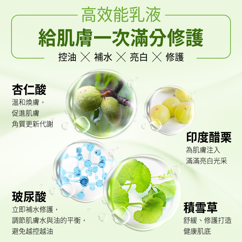 ‧油性肌/痘痘肌乳液推薦!保濕&控油兼具,增加水分減少油分,雙層修護讓肌膚不再越控越油,杏仁酸添加緊緻毛孔同時溫和代謝老廢角質,有效解決痘痘困擾。