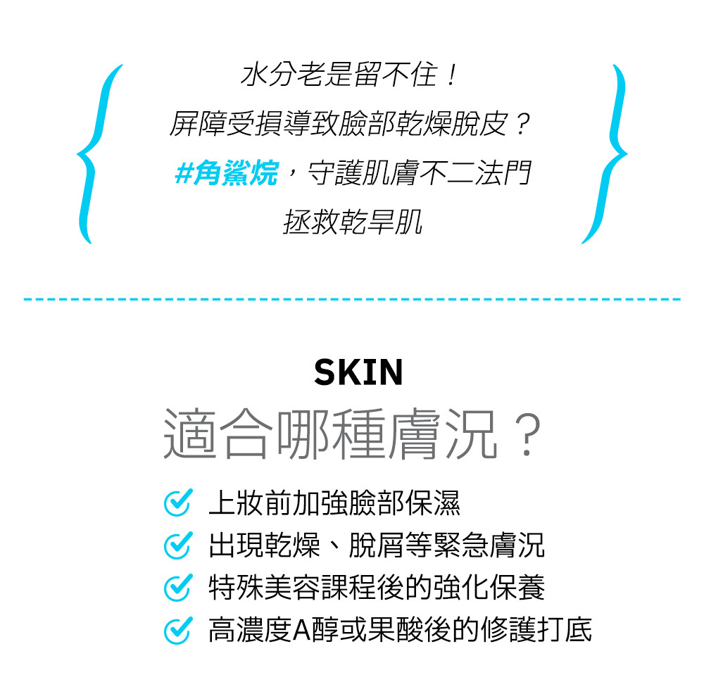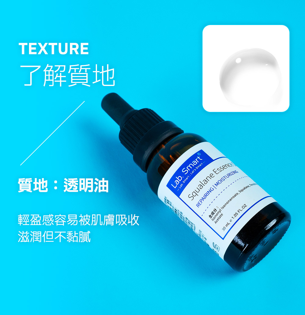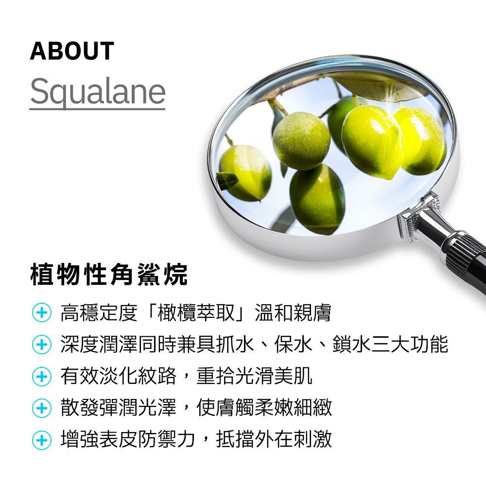 質地清爽不油膩,肌膚吸收後長效保濕鎖水,形成保護屏障,幫助肌膚修復,重現透嫩潤澤的健康膚觸,植物性角鯊烷萃取自「橄欖」與肌膚親和力高。