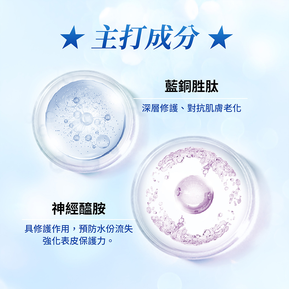 藍銅胜肽+神經醯胺的黃金組合,可減緩老化、淡化細紋。