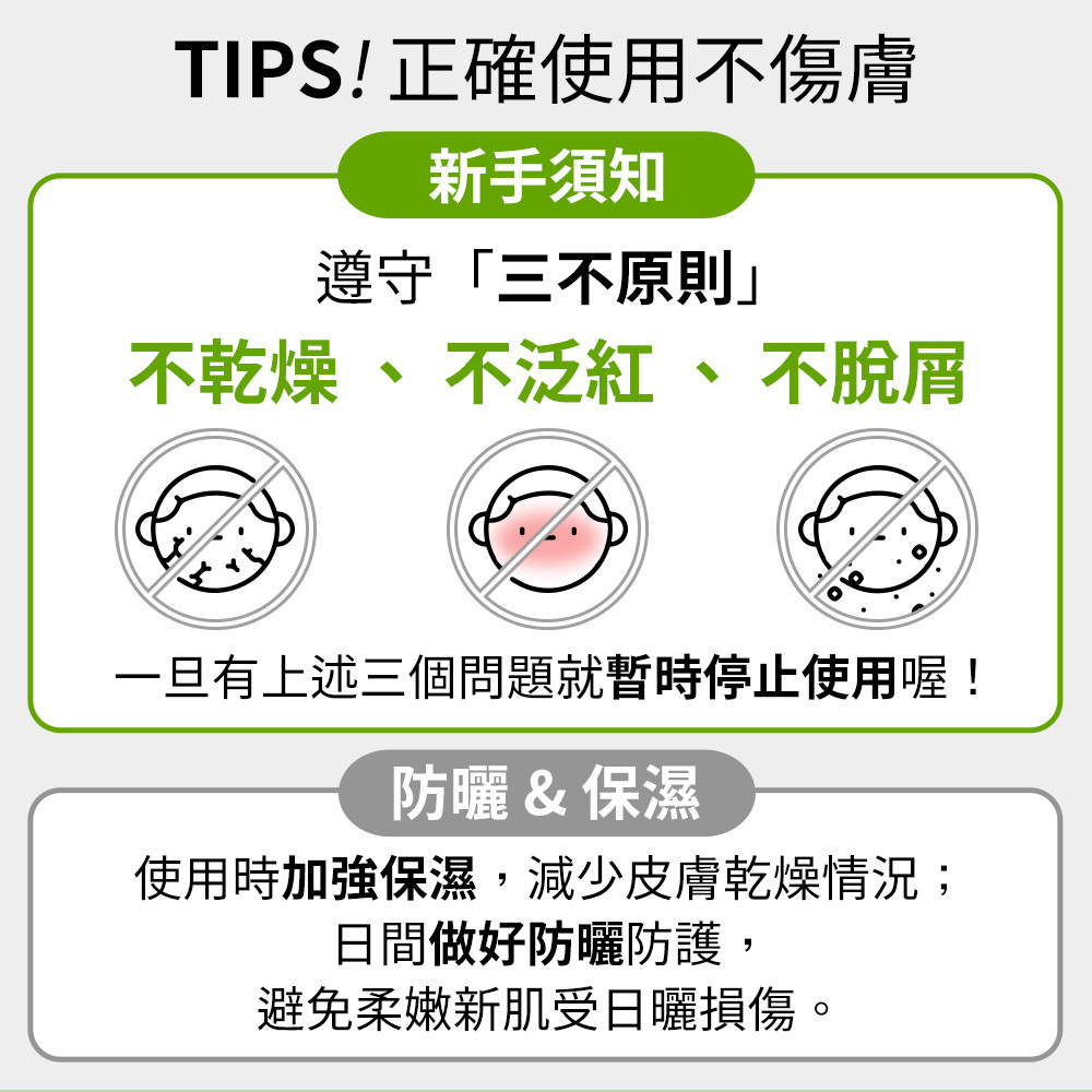 • 使用方式:視個人膚質每日1-2次,於肌膚清潔後化妝水前取適量均勻塗抹臉部及頸部待吸收即可。如有乾燥脫屑現象請加強保濕產品。