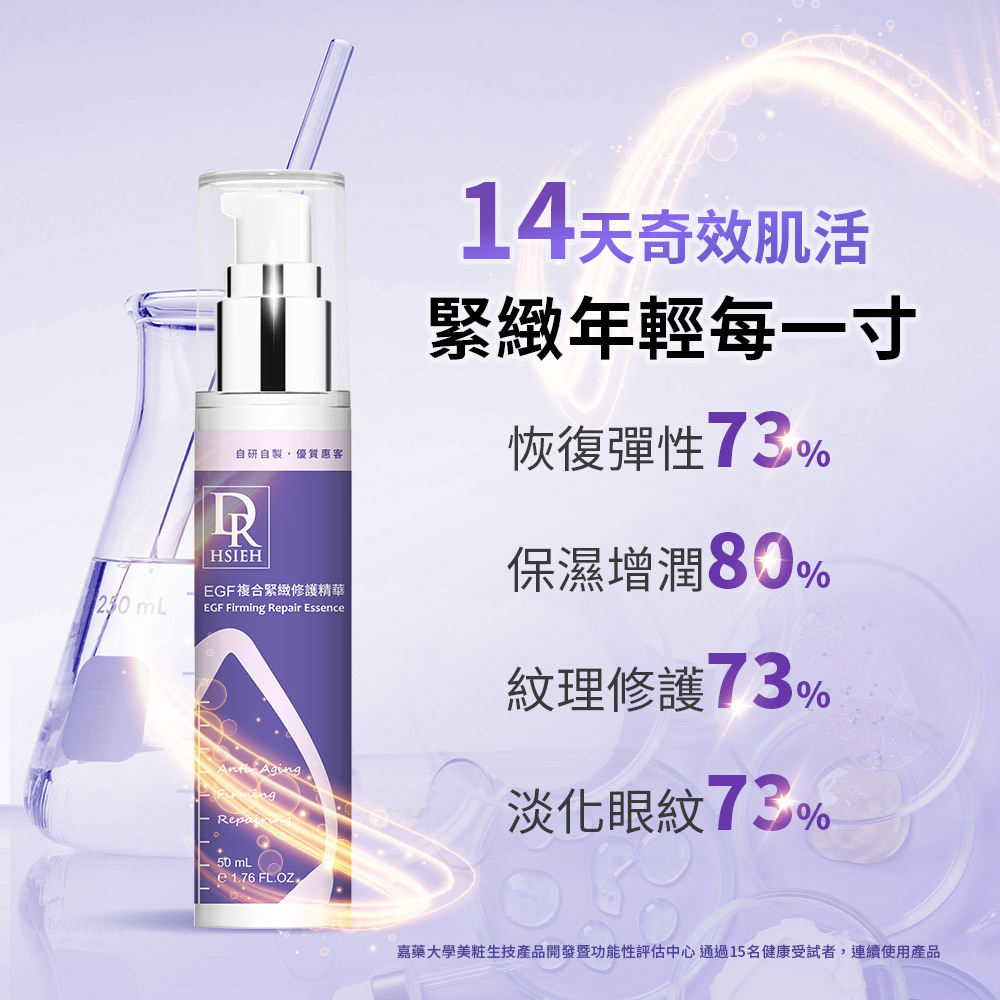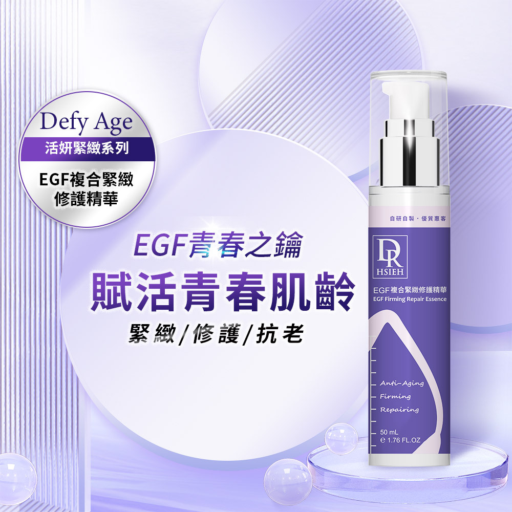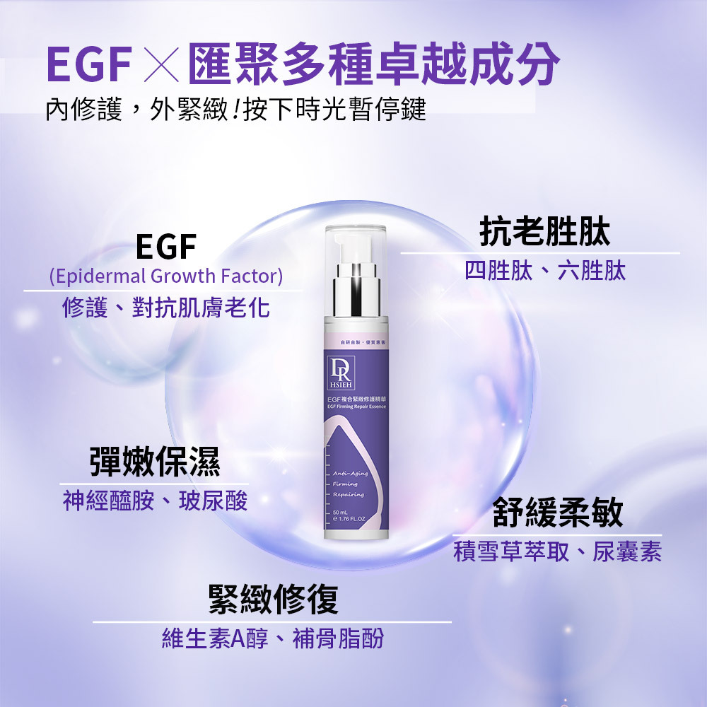 以珍貴EGF抗老成分結合複合胜肽、維生素A醇、補骨脂酚、積雪草、尿囊素等等,打造出緊緻、修護、抗老功效精華一瓶搞定,深入肌膚修護,穩定抗老效果。