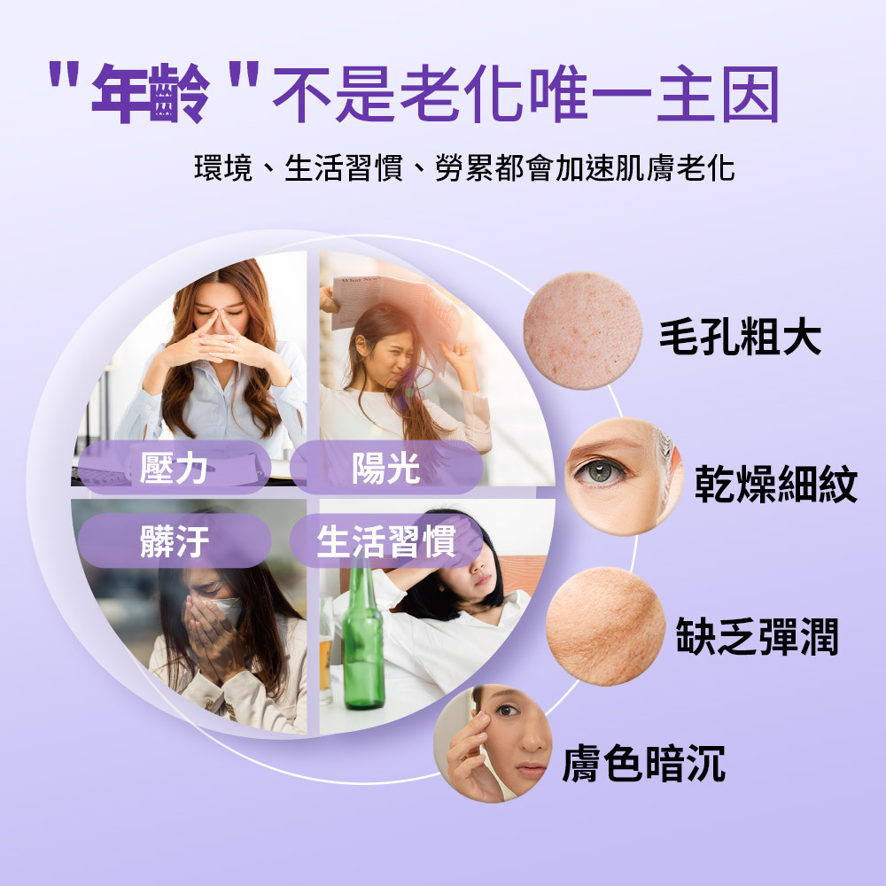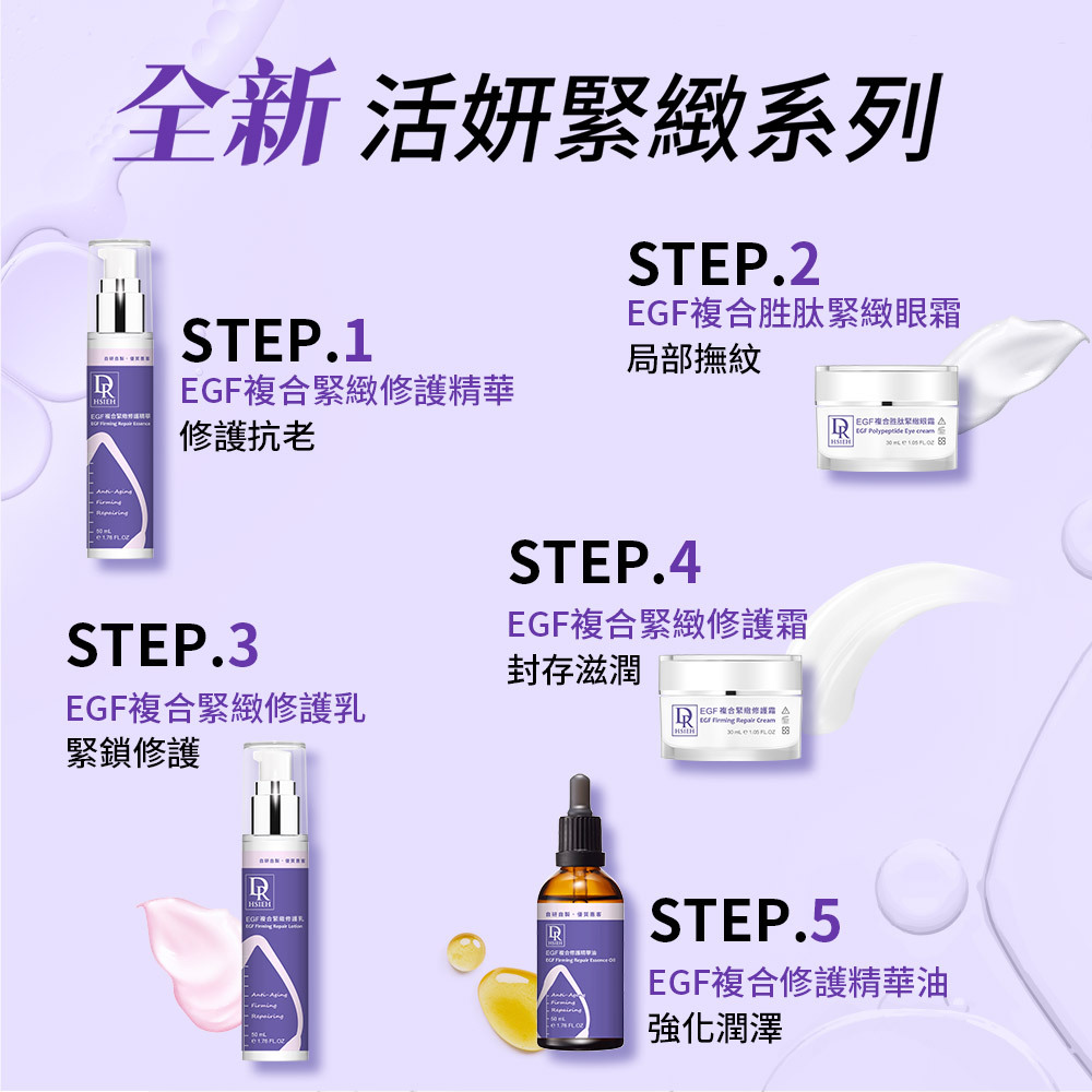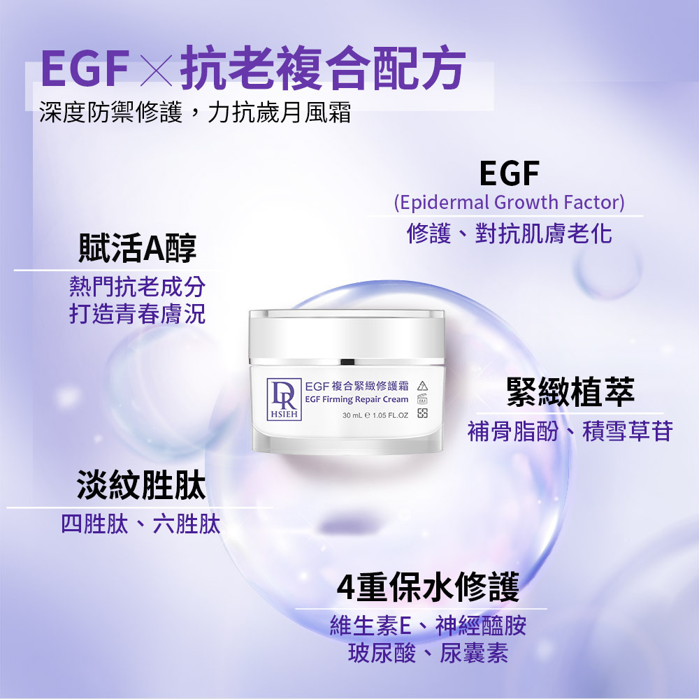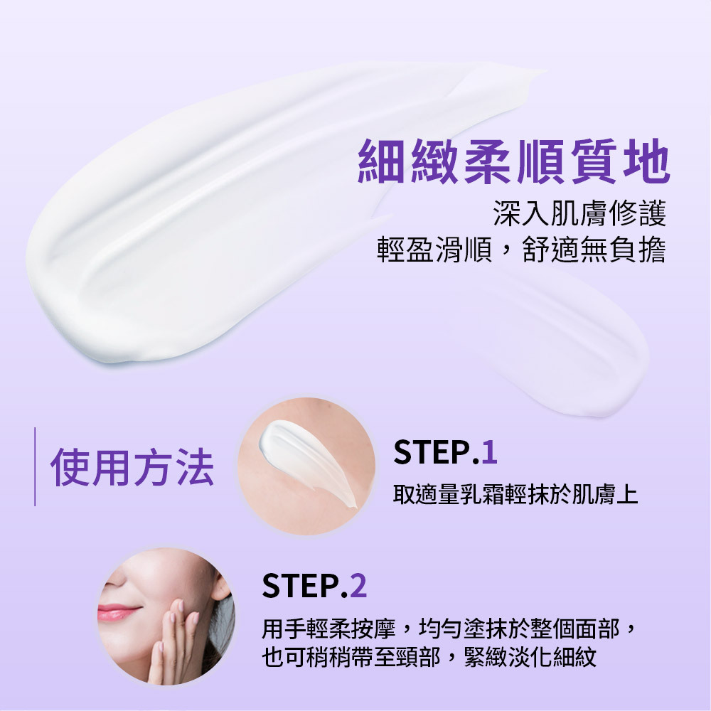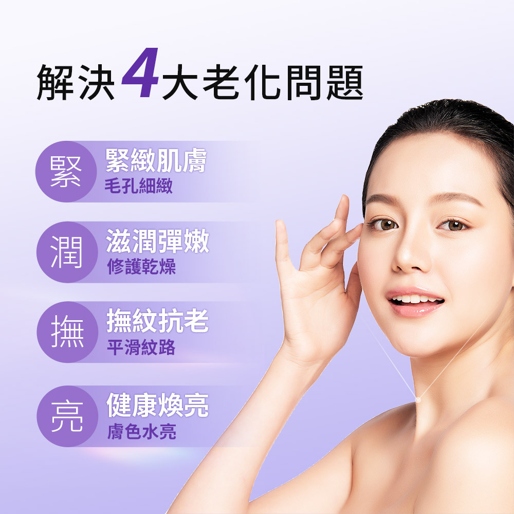 抗老聖品EGF搭配複合撫紋胜肽、維生素E、維生素A醇等多種植萃,深層修護、抗老緊緻撫紋,讓肌膚看見年輕的改變。