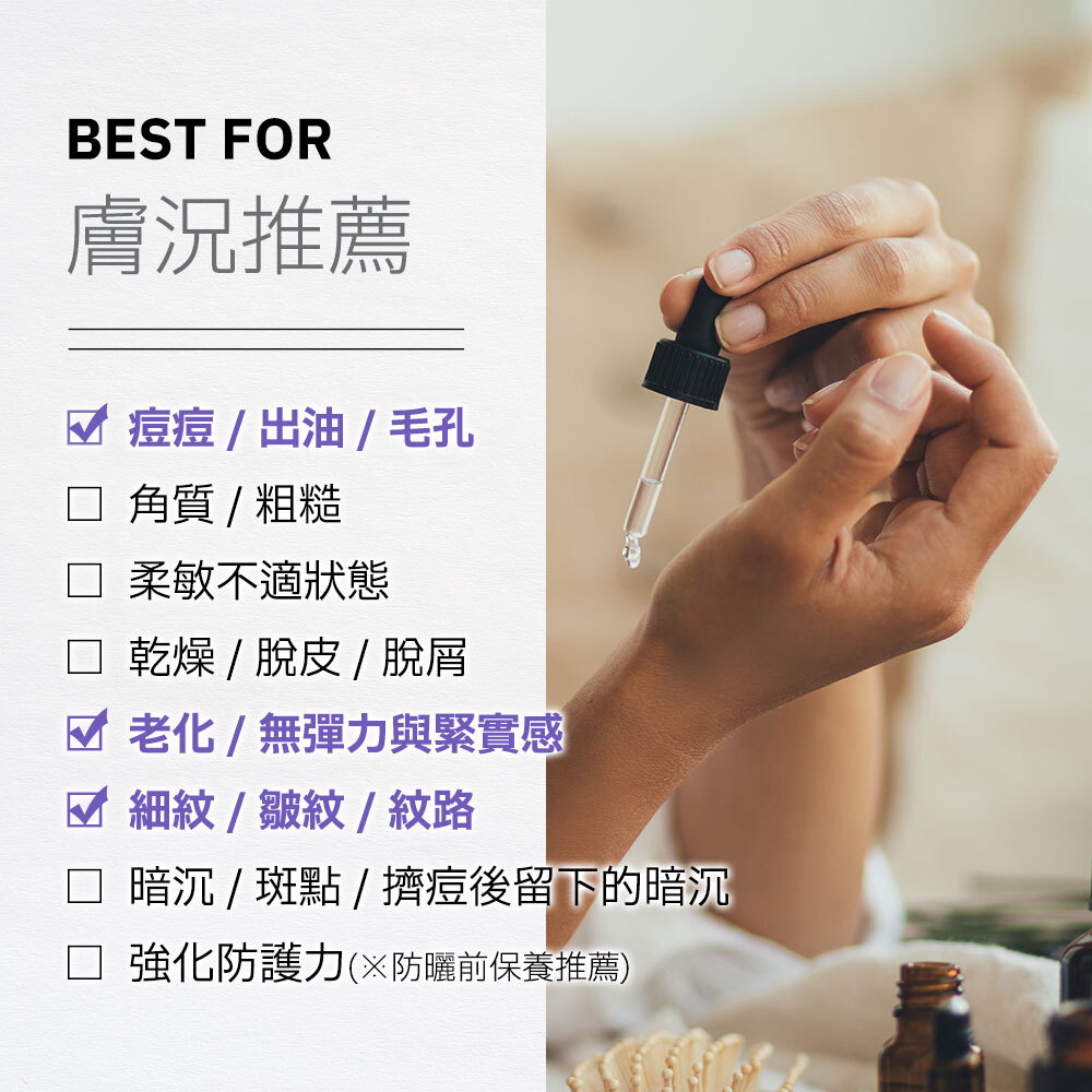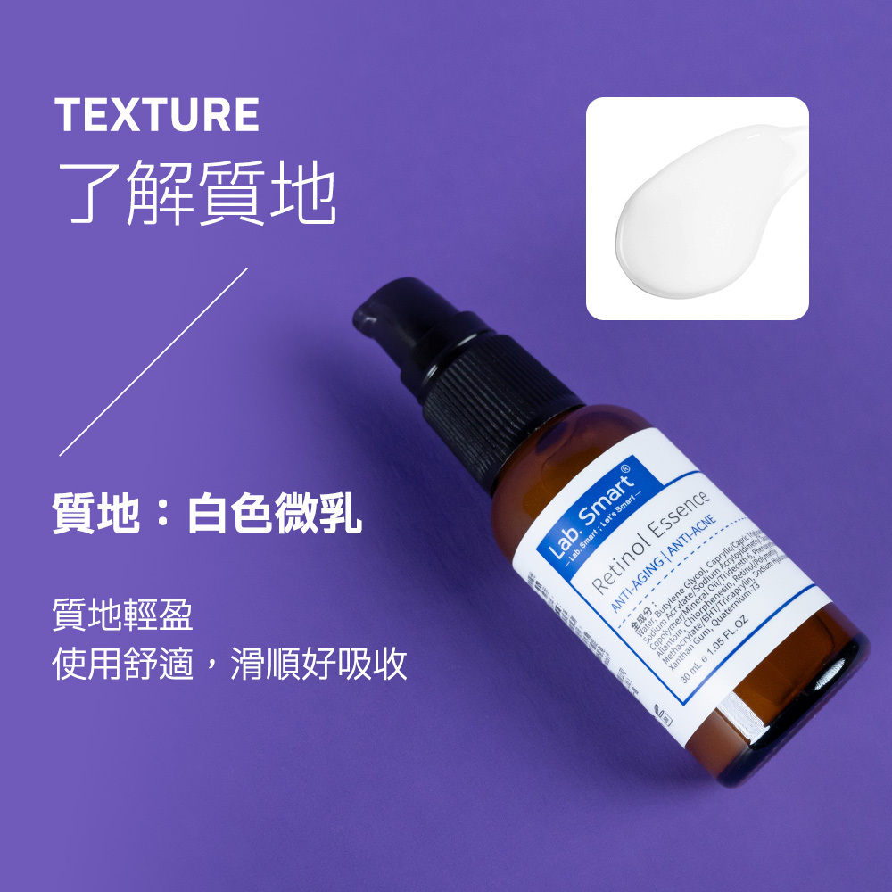 品牌暢銷NO.1 A醇保養品。入門款-0.2%維生素A醇精華,全方位精準抗痘、淨化毛孔,同時改善暗沉、老化與各種紋路,提升緊實感、細緻膚觸,打造平滑、透亮光澤的健康肌。