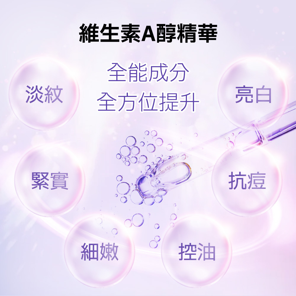 品牌暢銷NO.1 A醇保養品。入門款-0.2%維生素A醇精華,全方位精準抗痘、淨化毛孔,同時改善暗沉、老化與各種紋路,提升緊實感、細緻膚觸,打造平滑、透亮光澤的健康肌。