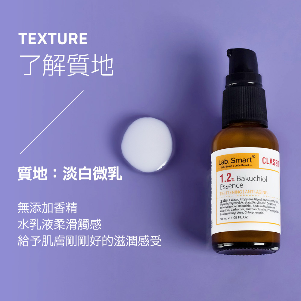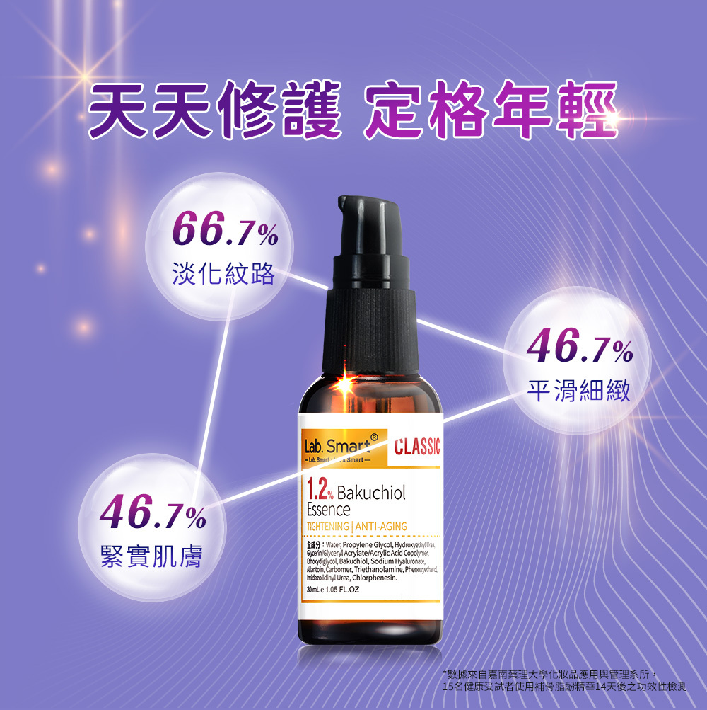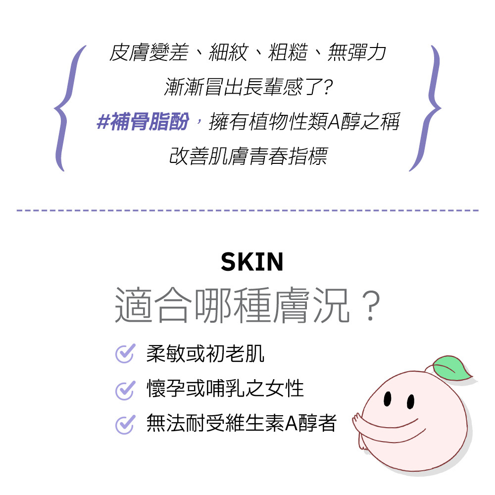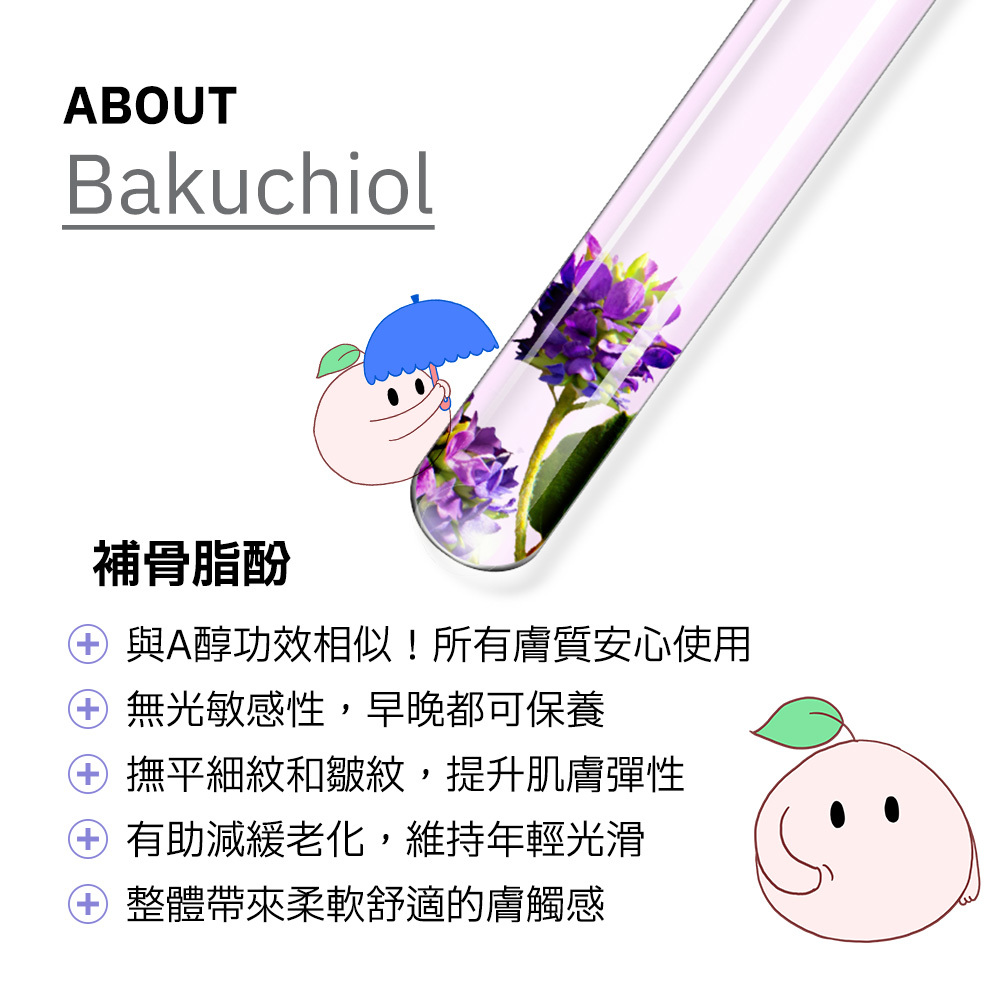 口碑抗老保養成分【補骨脂酚】,有植物性類A醇之稱,補骨脂酚功效保養更溫和、無副作用。可改善肌膚老化問題,提升肌膚緊緻及光滑,撫平細紋,回復肌膚彈性。