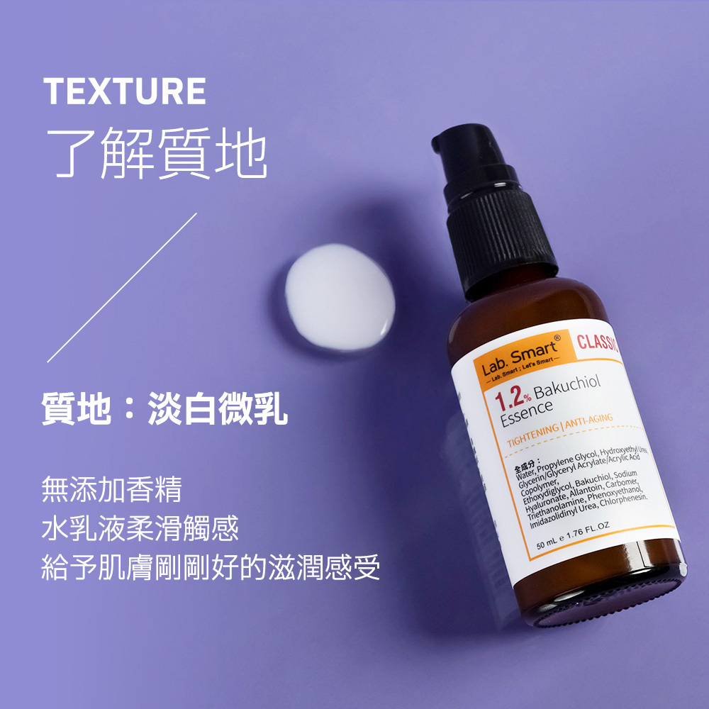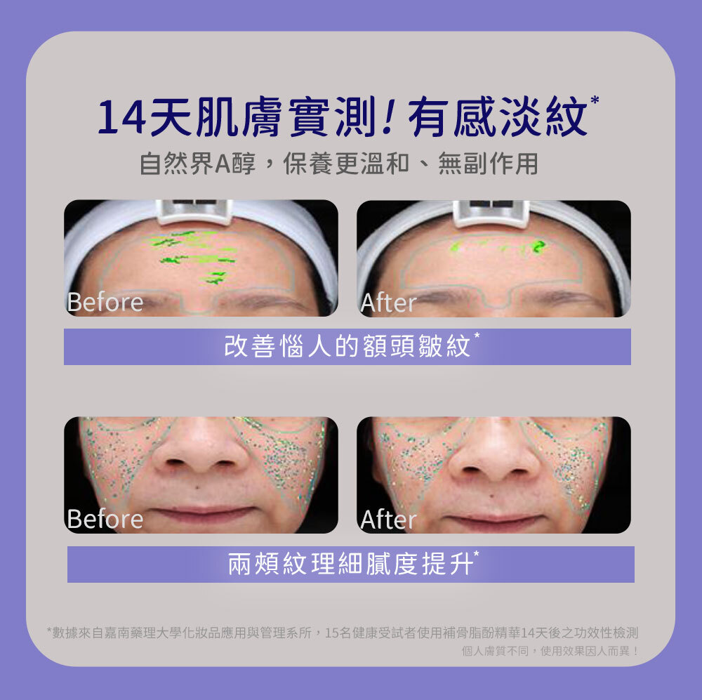 口碑抗老保養成分【補骨脂酚】,有植物性類A醇之稱,補骨脂酚功效保養更溫和、無副作用。可改善肌膚老化問題,提升肌膚緊緻及光滑,撫平細紋,回復肌膚彈性。