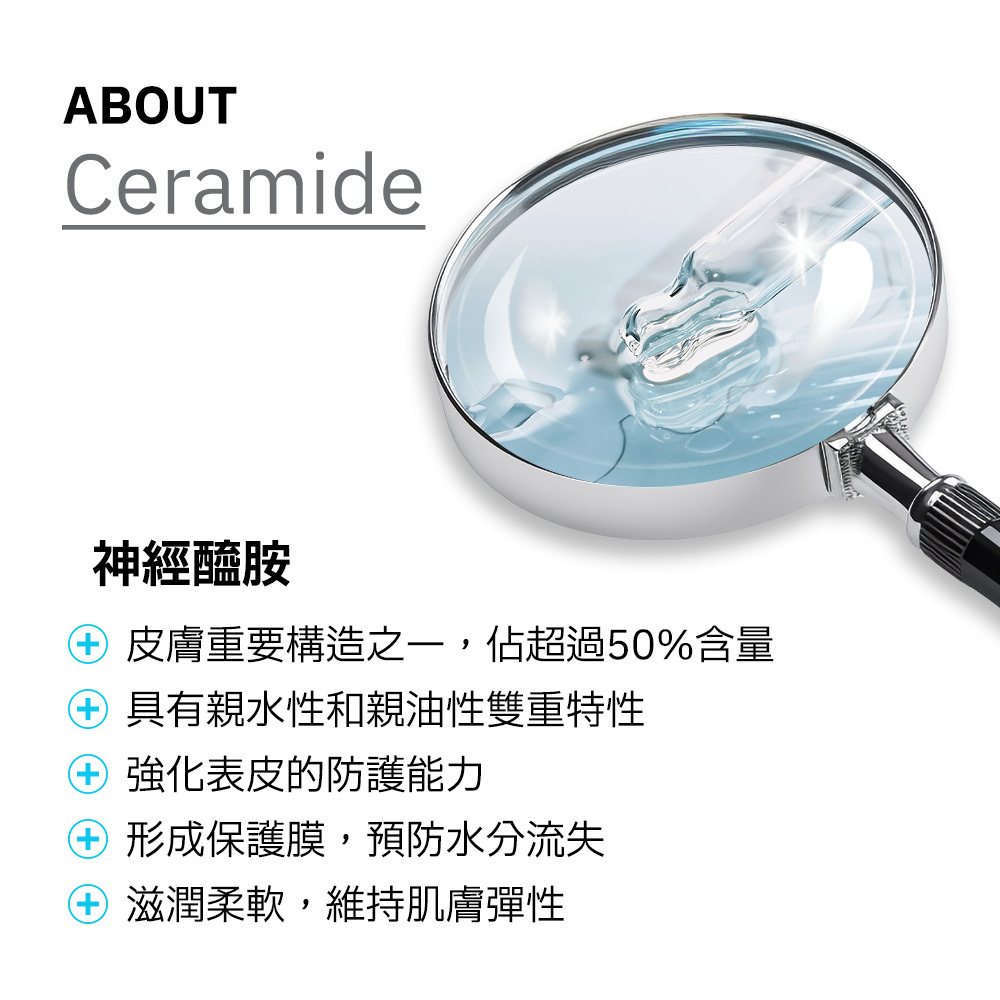 最常見的保濕成分-神經醯胺,堪稱保濕神器!強大水分子釘,幫助皮膚補水修護,避免水分流失,減少皮膚乾燥、粗糙問題。