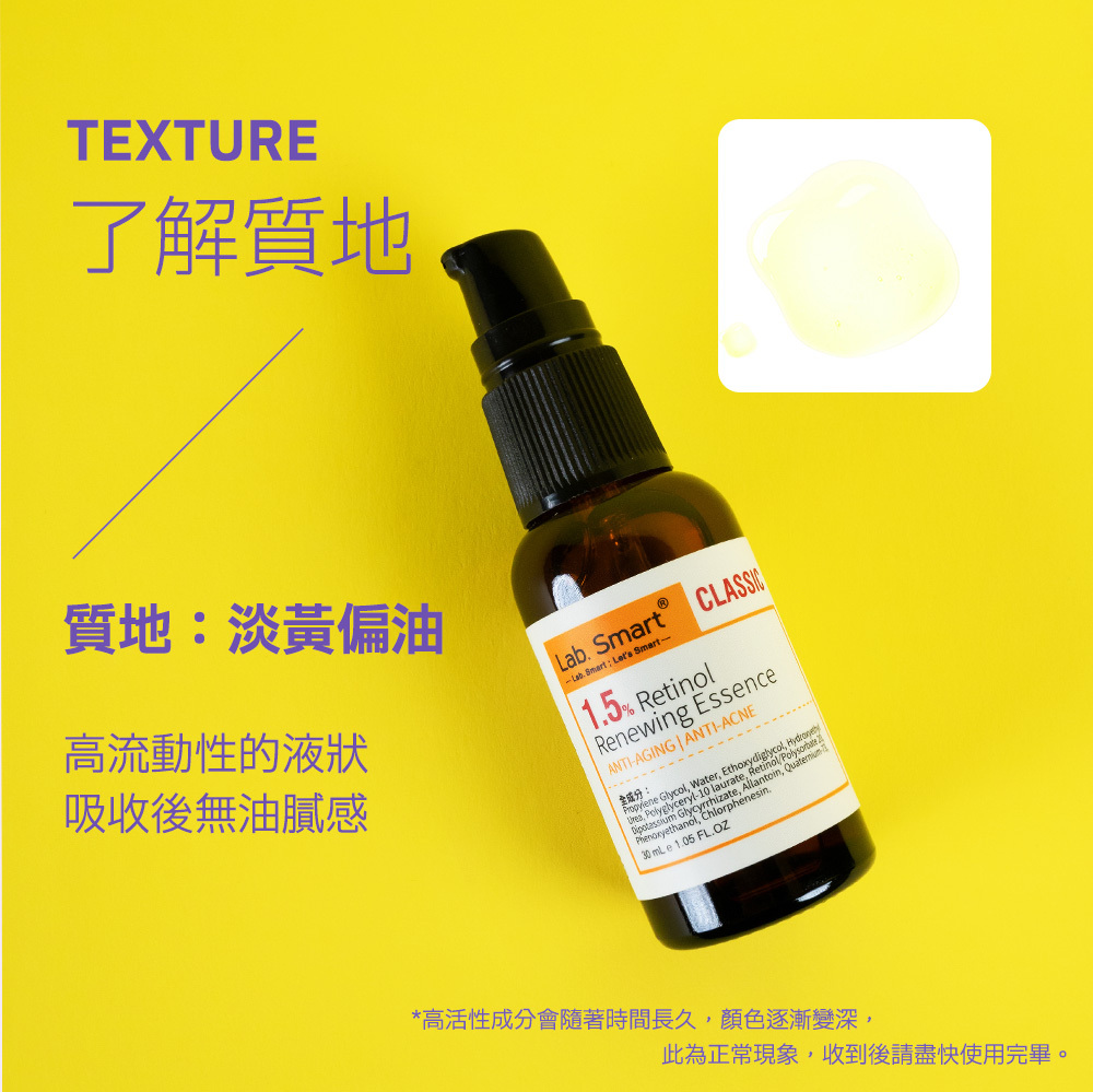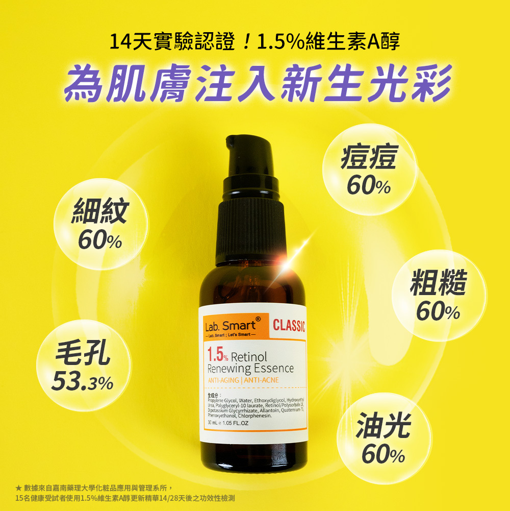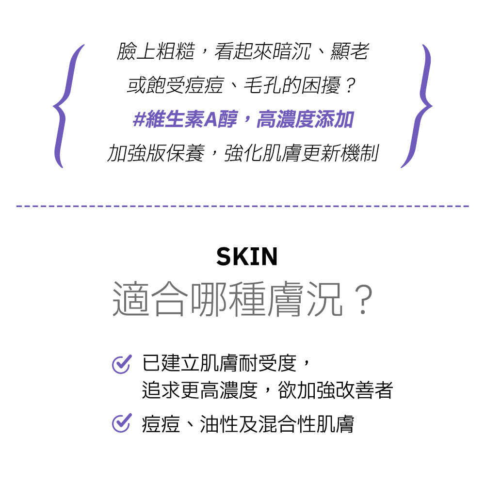 品牌熱銷NO.1 A醇保養品!1.5%維生素A醇高濃度添加,14天有效實證!改善粗糙、淡化細紋,調理痘痘與油光,A醇功效打造皮膚平滑緊實,恢復年輕彈力。