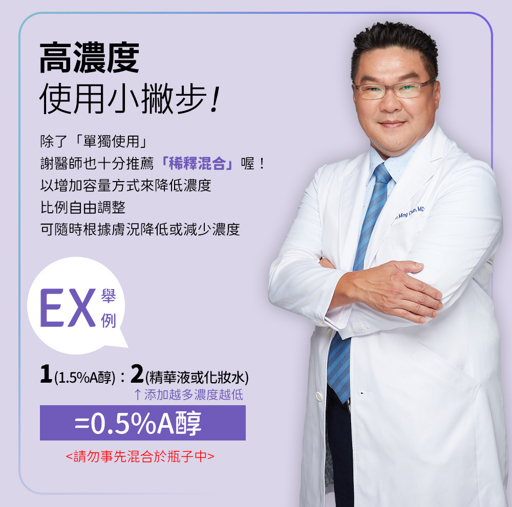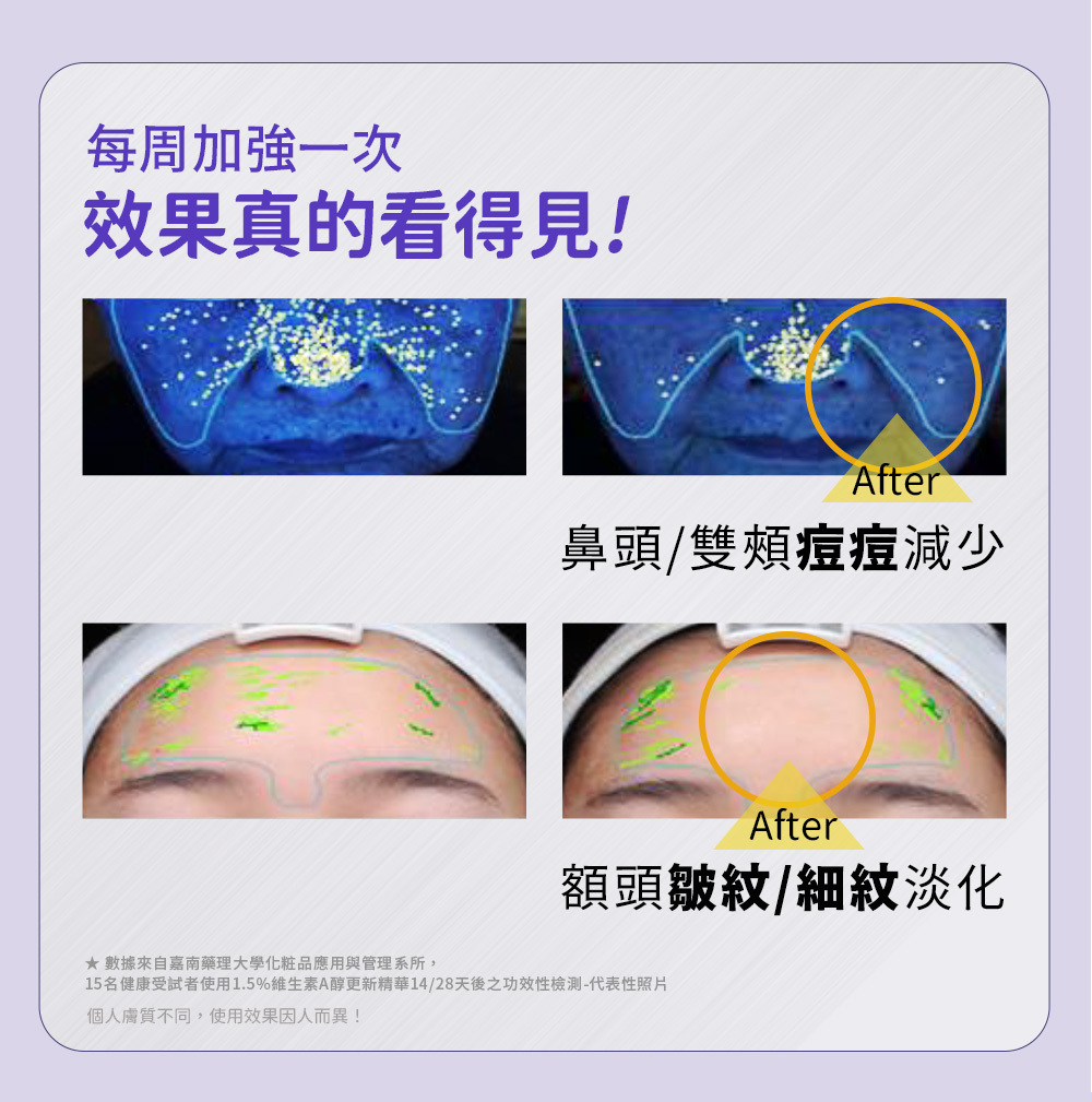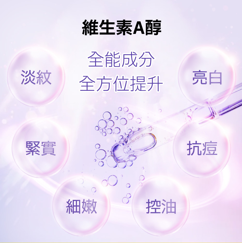 品牌熱銷NO.1 A醇保養品!1.5%維生素A醇高濃度添加,14天有效實證!改善粗糙、淡化細紋,調理痘痘與油光,A醇功效打造皮膚平滑緊實,恢復年輕彈力。